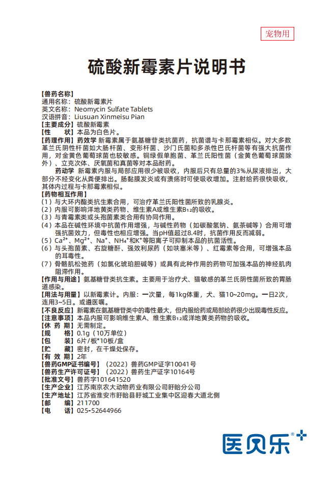 通用名:硫酸新霉素片 兽药批号:兽药字101641520 规格:100mg*6片/板*10板/盒 适应症:用于治疗犬、 猫敏感的革兰氏阴性菌所致的胃肠道感染,如: 1、急发性腹泻 2、肠胃炎症 3、腹痛腹胀 4、呕吐、体温升高、厌食、精神沉郁等 用法用量:内服,一次量,每1kg体重,犬、猫10-20mg。一日2次,连用3~5天。或遵医嘱。