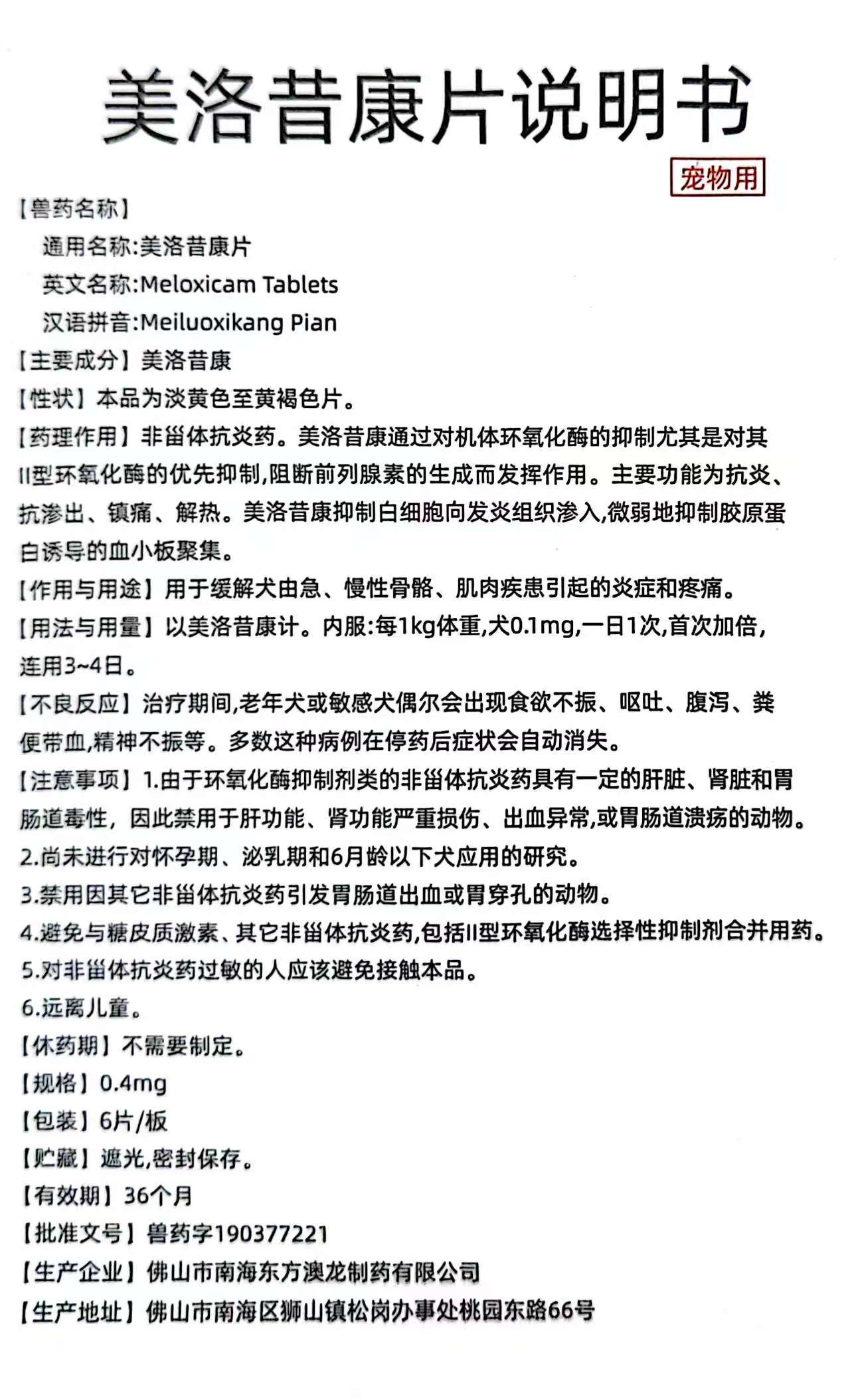 适应症:用于缓解犬由急、慢性骨骼、肌肉疾患引起的炎症和疼痛。