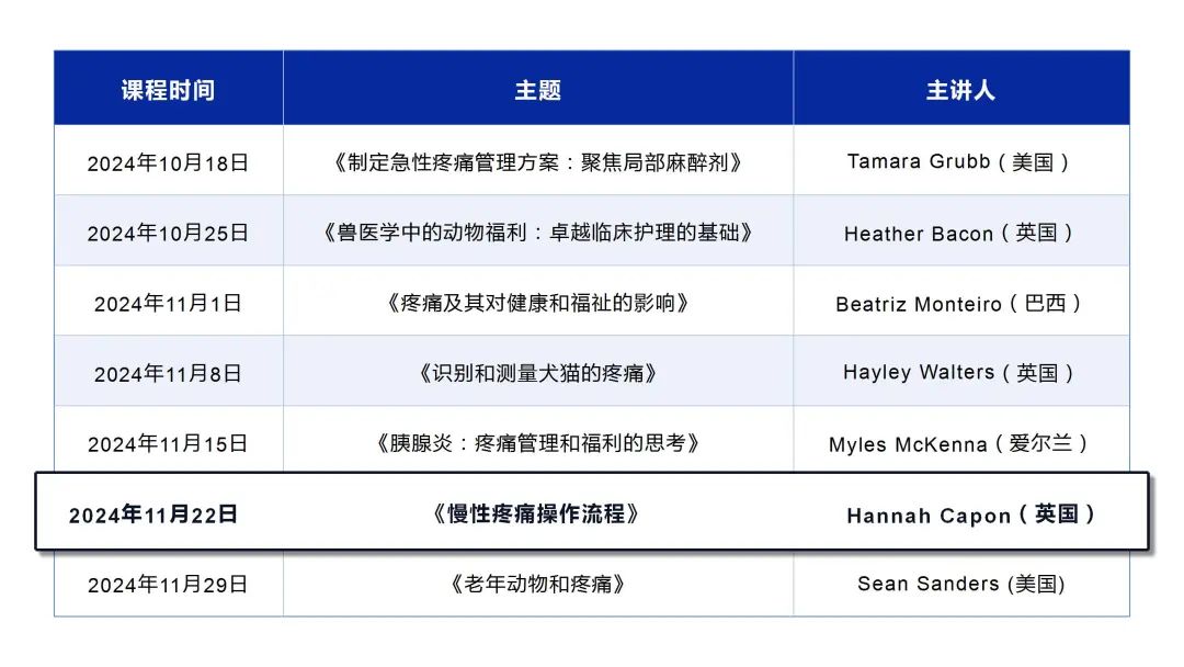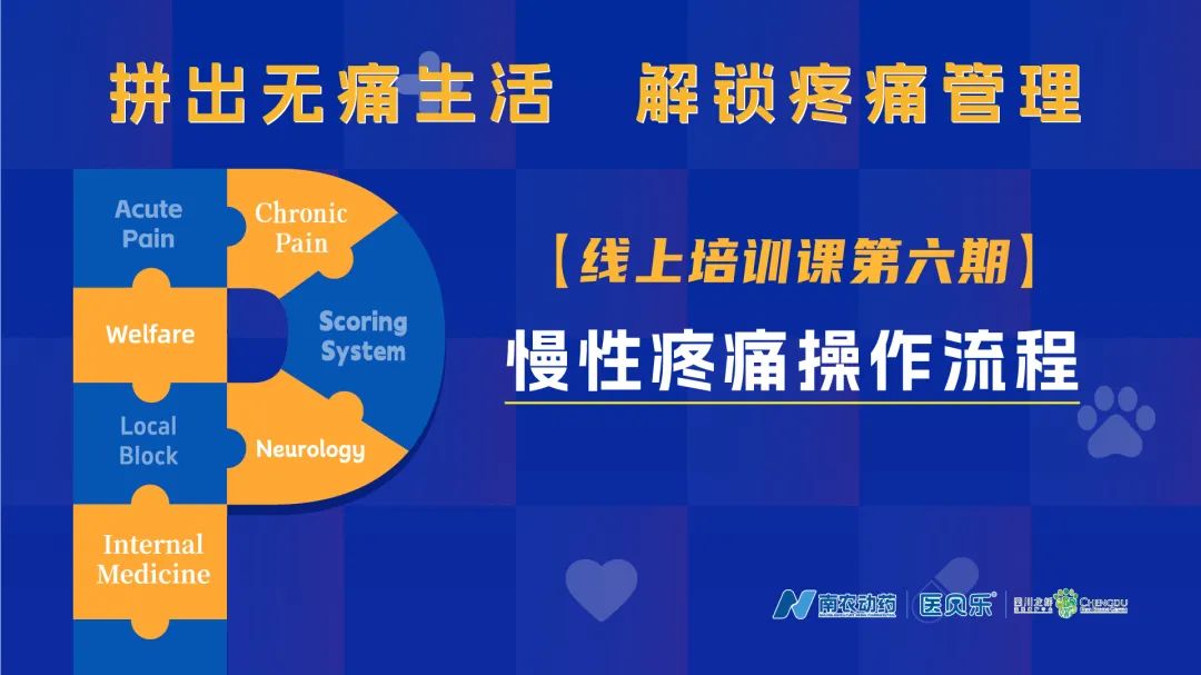 【线上培训课第六期】慢性疼痛操作流程课程精彩回顾 南农动药医贝乐品牌线上培训课第六期 开课啦!!! 01# 第六期线上课程 慢性疼痛操作流程/Hannah Capon 这一期的视频中,Hannah老师主讲了《慢性疼痛操作流程》。Hannah老师详细地向大家描述了慢性/持久性/适应不良性疼痛的产生原因及其对动物的影响。 对于犬猫而言慢性疼痛是非常容易被忽视的问题,大多数宠主看到宠物没有跛行、没有哭喊、还可以吃喝,就会下意识认为好像没有特别大的问题。 然而我们常见的骨关节炎诱发的神经病理性疼痛没有预兆但是会伴随犬猫的生活中,导致情绪低落、活动性下降、焦虑等问题,从而影响动物的生活质量。宠主和兽医通过多方面的干预和治疗重建动物健康的身体和积极的生活状态。 课程亮点 ❤引发疼痛的原因 ❤通过哪几方面的干预和治疗可以重建动物健康 02# 经验分享 主治医生/王亚楠 有幸邀请到杭州四叶草动物医院,主治医生,王亚楠。王医生表示,慢性疼痛可不是小事,它可能会持续很长时间,对动物的生理、情绪和认知都有很大的影响。 曾经接诊过一位患有慢性骨关节炎的5岁猫咪,起初症状并不明显,是慢慢出现的,这就需要宠主能够及时注意到猫咪细微的变化。通过饮食及体重控制、生活方式及家庭环境改善、镇痛药、关节保护剂、理疗(比如针灸)等方式,共同帮助动物恢复活力。 南农动药医贝乐品牌线上培训课程安排