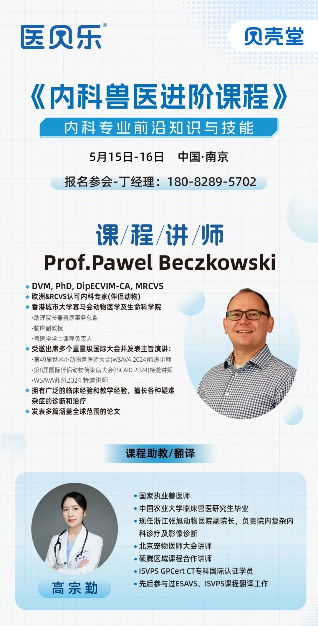 本次课程将由国际资深兽医内科教授 Pawel Beczkowski为您授课,机会难得,千万不要错过!期待与您在南京相聚,共同开启内科兽医诊疗新篇章!