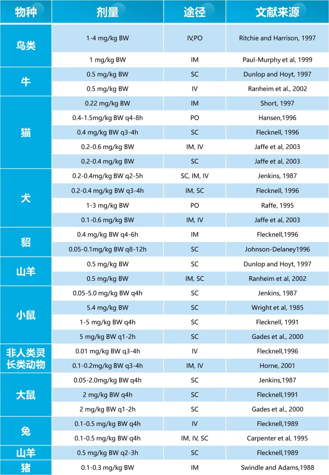 各物种的布托啡诺使用剂量参考:
