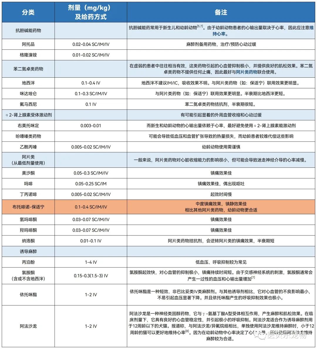 * 以上表格中的剂量为成年动物中推测而来,更推荐联合用药提供平衡麻醉。药物剂量在幼龄动物尤其是新生动物中推荐从最小剂量开始使用,期间需谨慎监测。