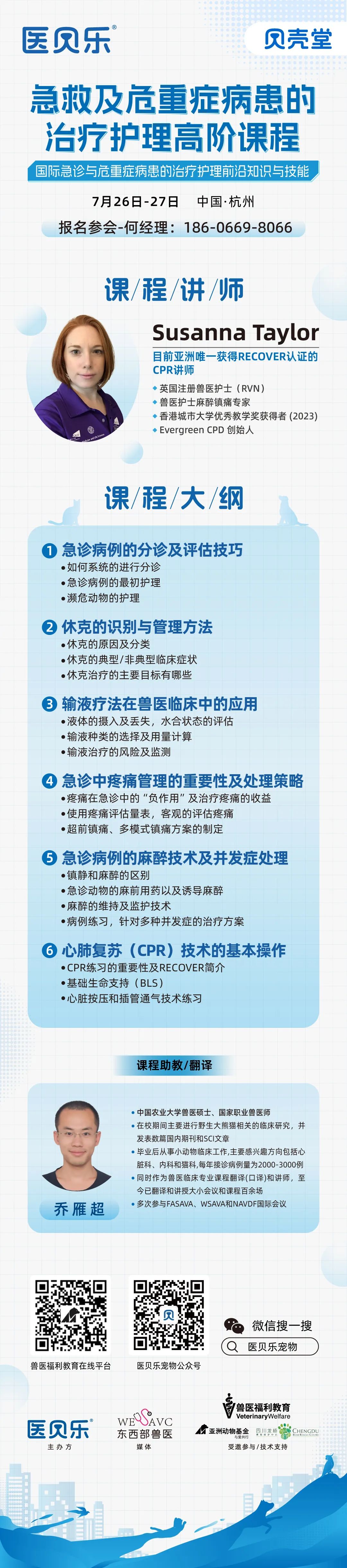 本次课程特邀Susanna Taylor老师也将针对指南新增“急救”领域开展深入交流探讨,同时也会对RECOVER CPR基本操作进行讲解,并在课后为兽医专业人员提供基本生命支持(BLS)认证和高级生命支持(ALS)认证,内容与国际前沿接轨,机不可失,需要前往学习交流的医师朋友们请抓紧报名啦!